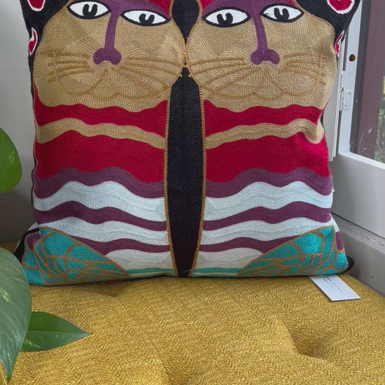 Expertly crafted embroidered pillow cover with artwork in the style of Laurel Burch. A wonderful way to add a dash of whimsy to any space! A great gift for the cat lovers in your life!