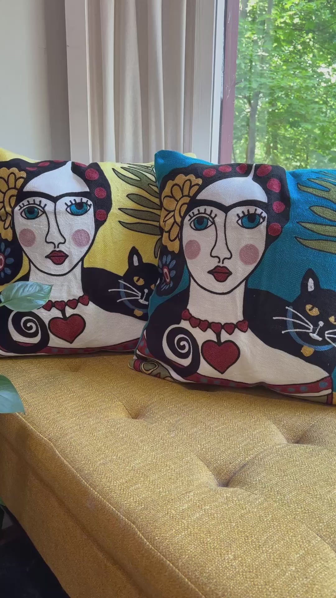 Gorgeous embroidered throw pillow Frida Kahlo art inspired design. Perfect for adding color and inspiration to your eclectic home!