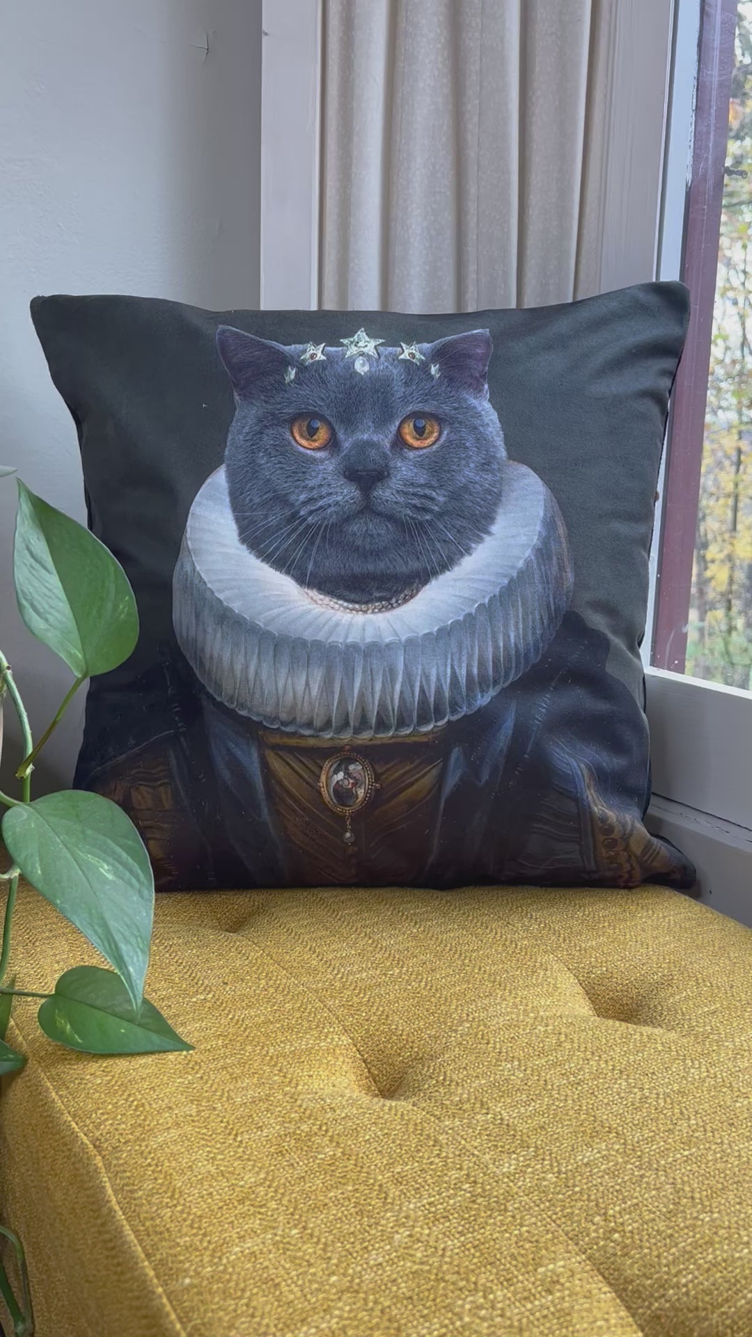 Elevate your decor with this unique 18x18 Regal Cat Pillow Cover. Featuring a majestic gray cat adorned in Renaissance-style attire, complete with a ruffled collar and a crown of stars, this pillow adds a luxurious and whimsical touch to any space. The high-quality fabric and rich, dark green background ensure durability and a timeless aesthetic, making it perfect for eclectic, vintage, or pet-inspired decor.
