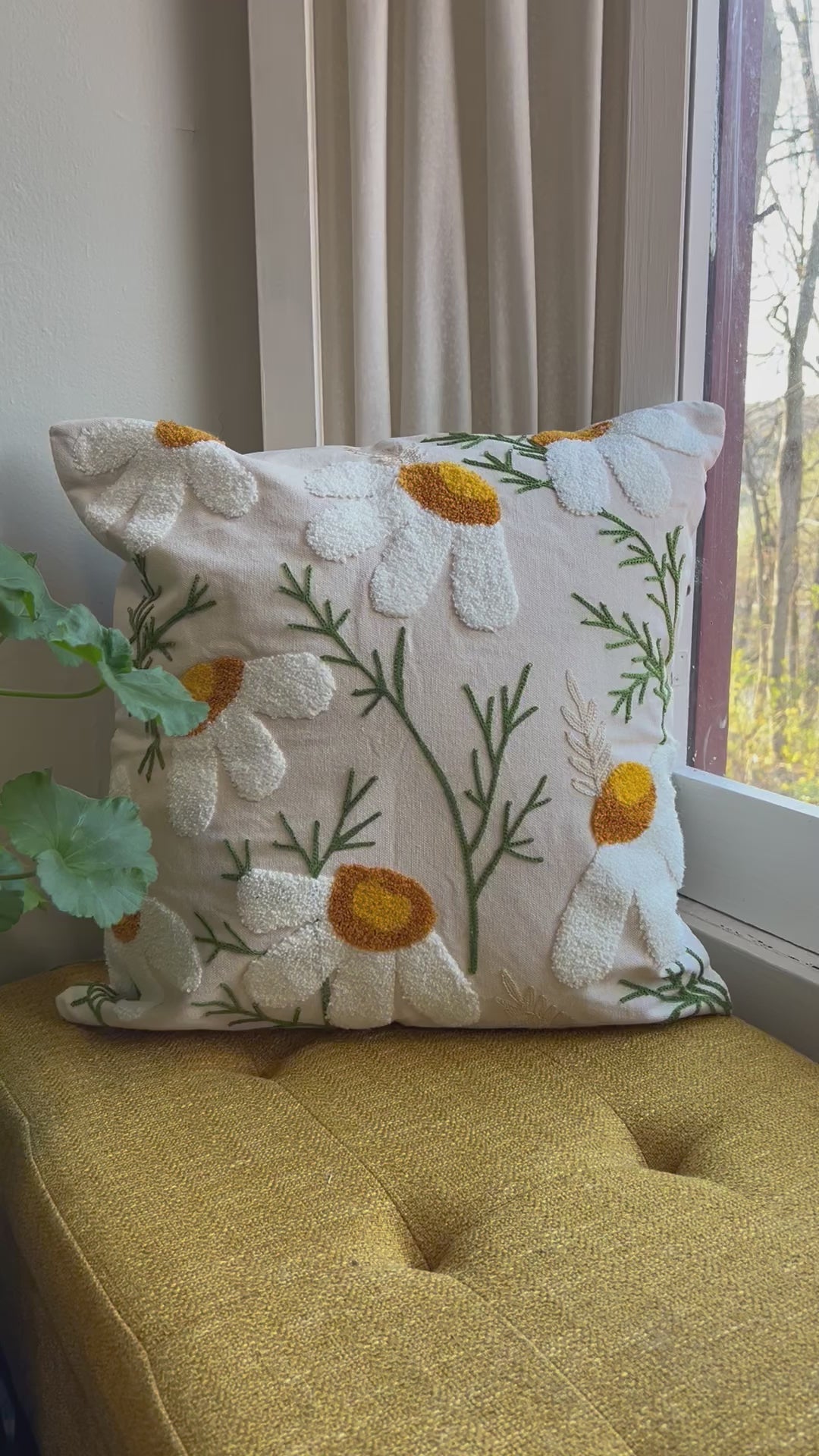 Transform your living space into a luxurious and artistic oasis with our Daisy Embroidered Throw Pillow Cover. Expertly crafted from high-quality heavy cotton fabric, this 18x18 inch pillow cover features a stunningly vibrant sunflower design with tufted details. Elevate your decor and add a touch of elegance with this exclusive and tasteful addition. Insert not included.