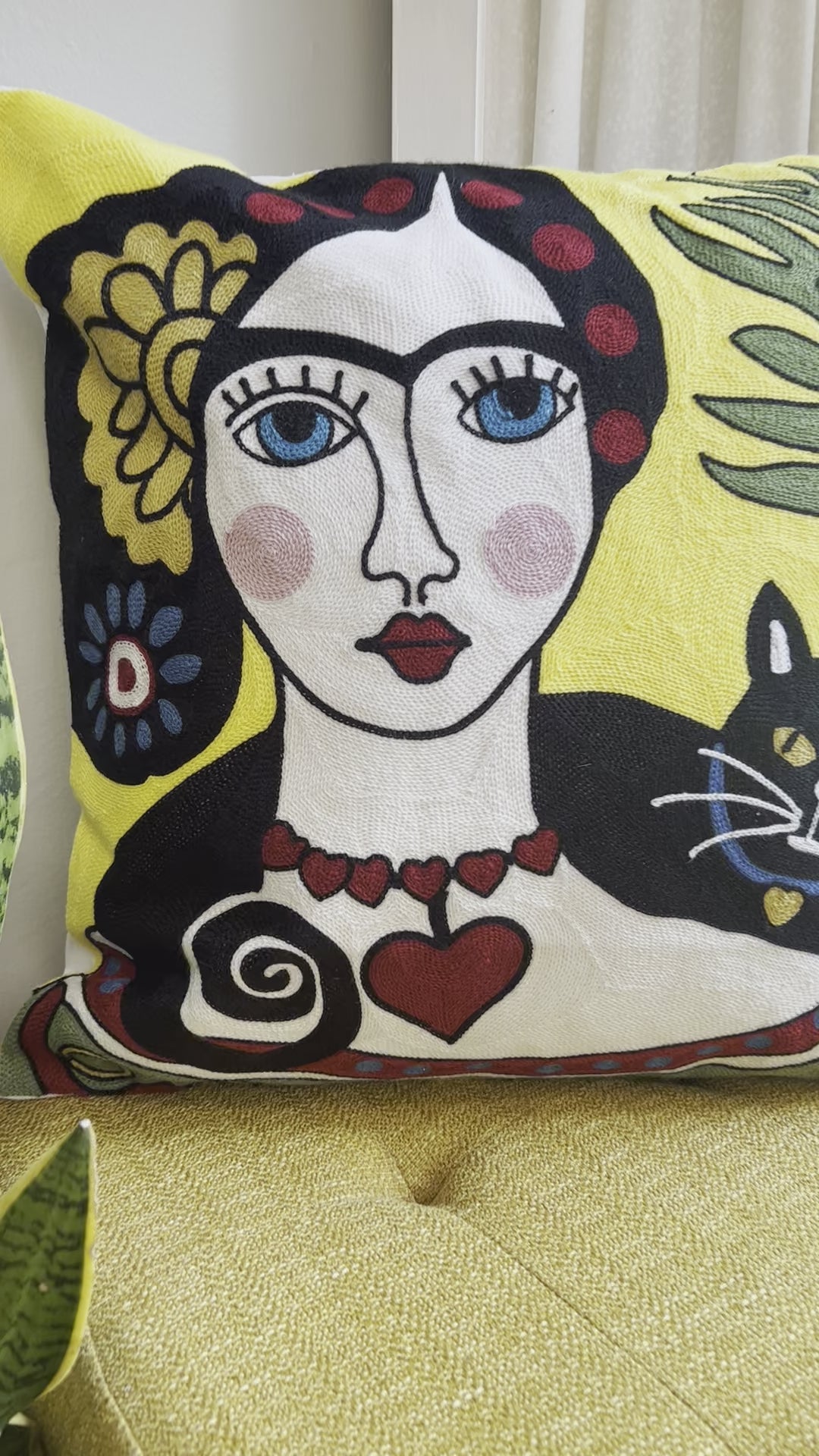 Gorgeous embroidered throw pillow with a Frida Kahlo self portrait inspired design. Perfect for adding color and inspiration to your eclectic home!
