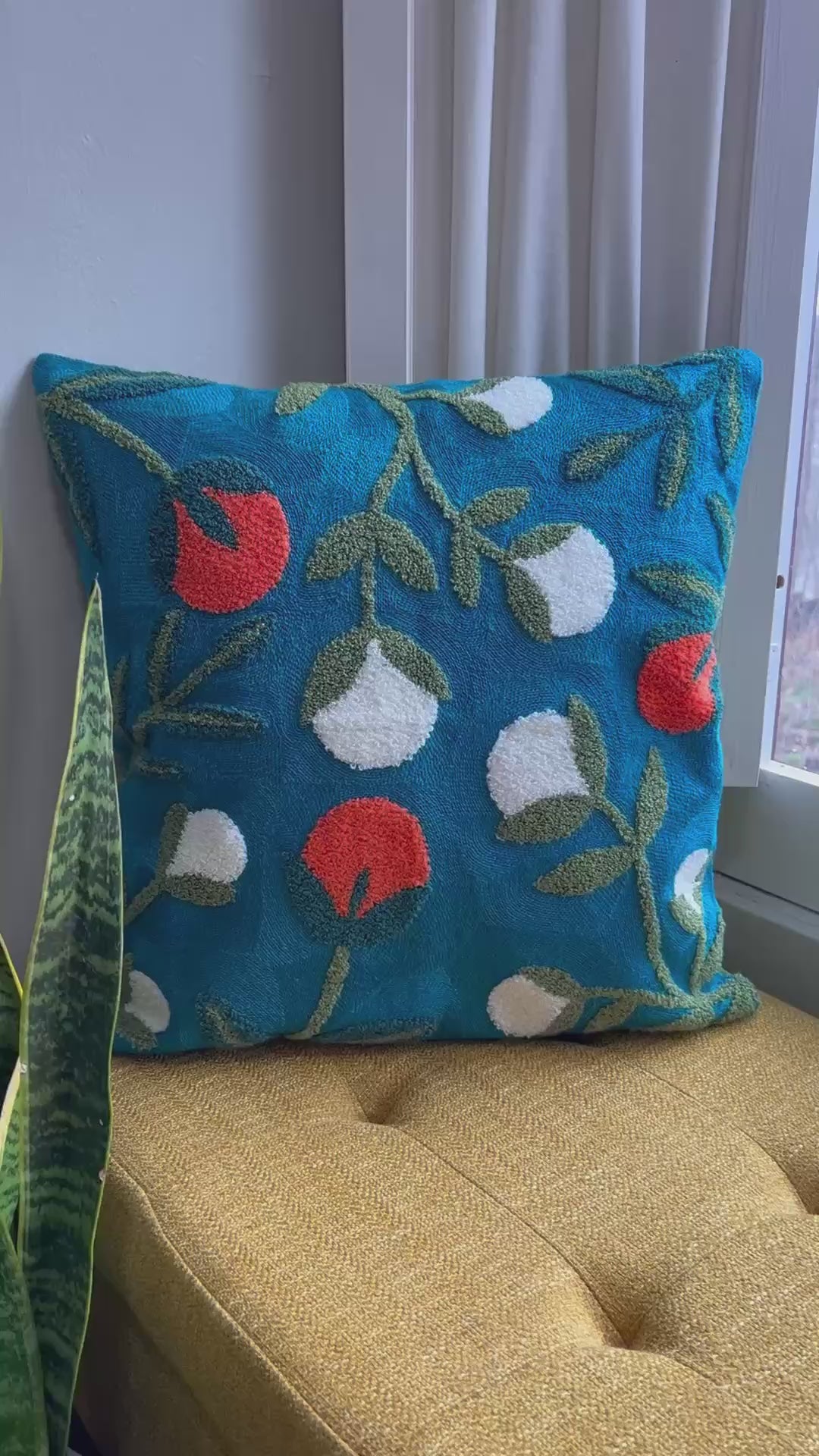 Transform your living space with this stunning 18x18 inch pillow cover featuring intricate embroidery in vibrant orange and white floral patterns on a bold blue background. The textured design, accented with green leaf details, adds a touch of artistic charm to your home decor, blending contemporary style with timeless craftsmanship.