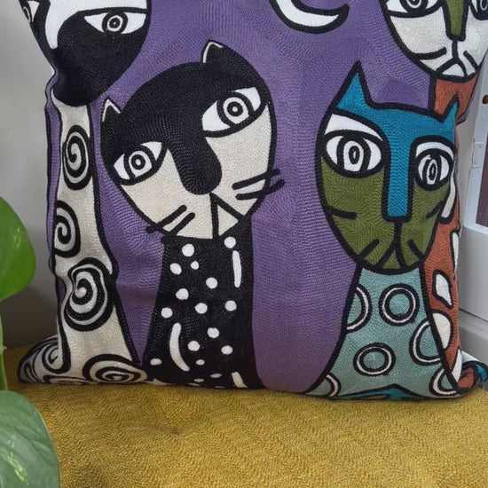 This adorable pillow cover is expertly woven into thick cotton canvas fabric. The design is inspired by the beloved Laurel Burch. Sure to be a conversation piece in any cat lovers home or office!